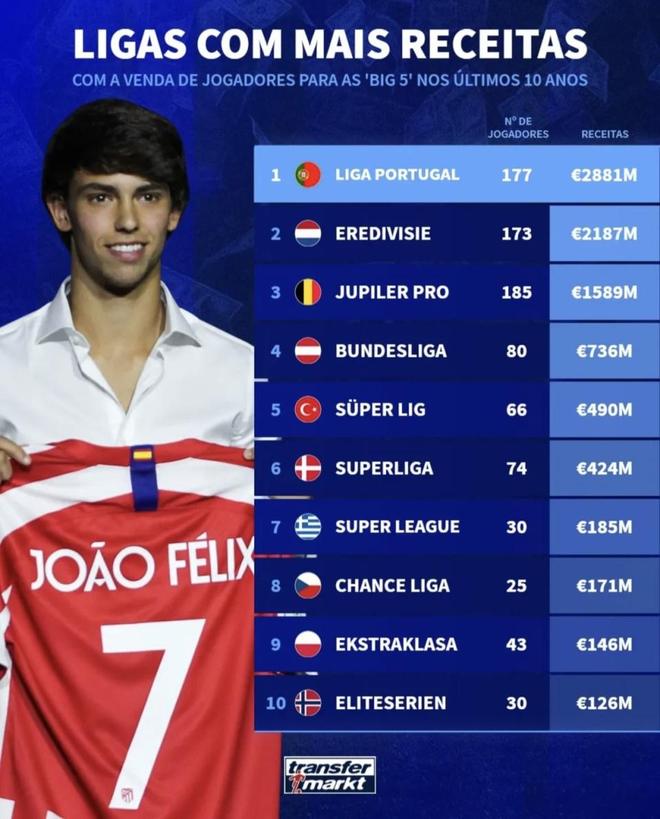 权威媒体发布近10年非五大联赛向五大联赛输出球员 葡超水货多?